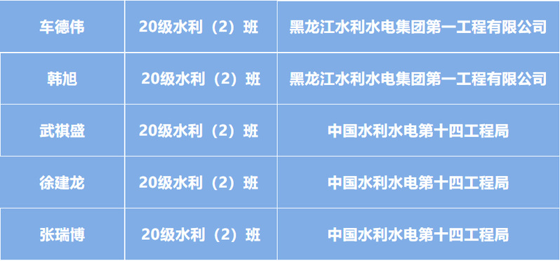 车德伟,20级水利(2)班,共青团员,在校期间多次参加社会实践活动。已与黑龙江水利水电集团第一工程有限公司签约。